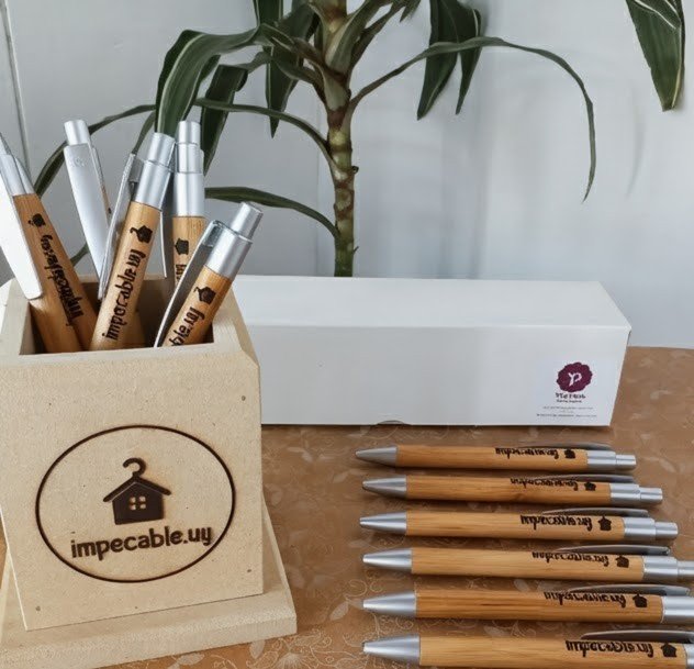 Descubre nuestras lapiceras y portalápices personalizados para empresas, fabricados con madera de la más alta calidad. Nuestros productos no solo destacan por su diseño elegante, sino también por su funcionalidad práctica y durabilidad. Cada pieza es elaborada cuidadosamente, garantizando un estilo que complementará cualquier espacio profesional.